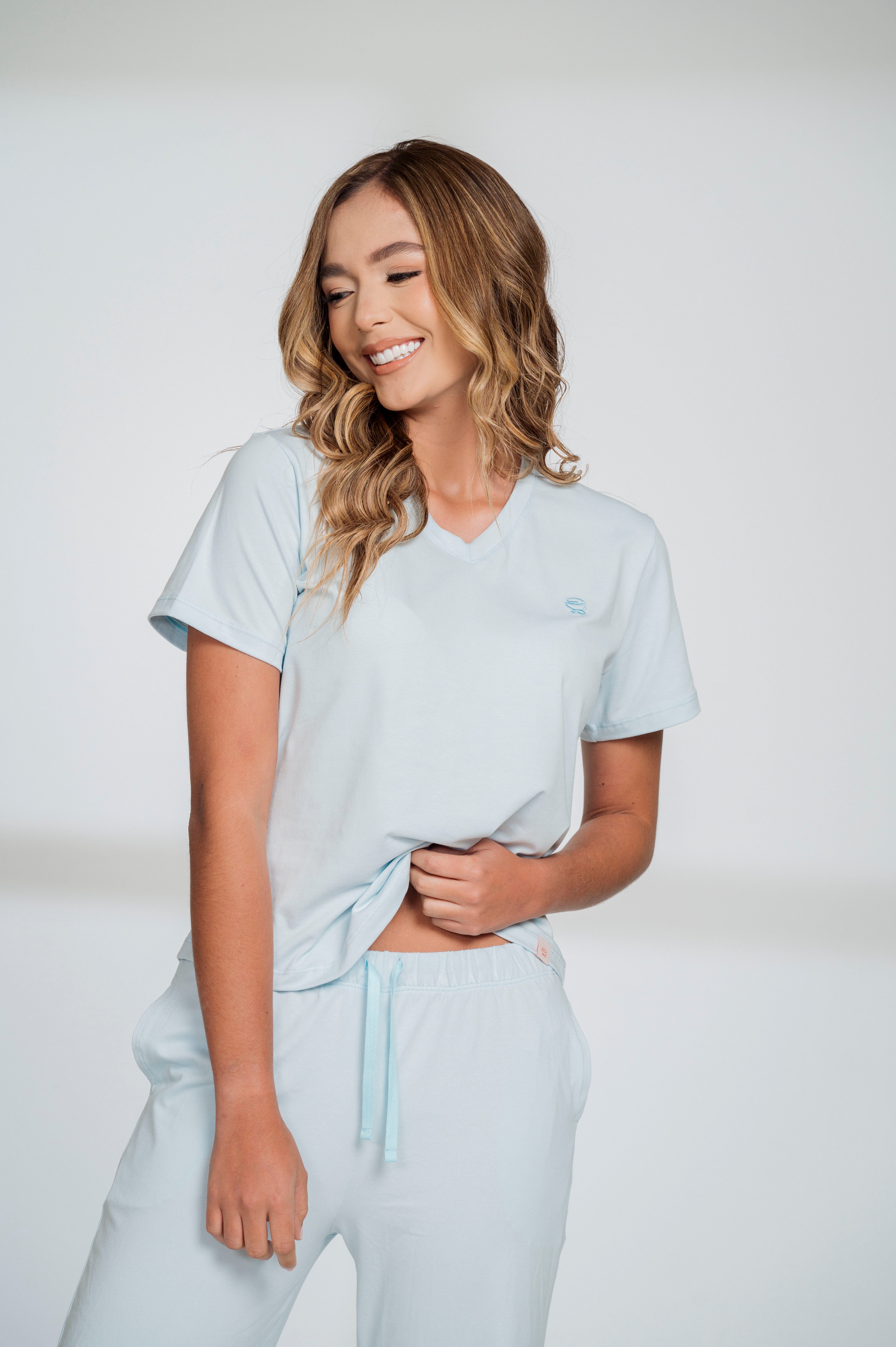 Relájate con la frescura y ligereza de la Pijama Ariana blue, un conjunto de dos piezas diseñado para brindar el máximo confort sin perder estilo. Su camiseta de manga corta con escote en V se combina con un pantalón largo de tiro medio con cordón ajustable y bolsillos laterales, ideal para quienes buscan practicidad y suavidad en sus noches de descanso. El tono azul cielo transmite serenidad, perfecto para dormir o disfrutar de un día relajado en casa.
